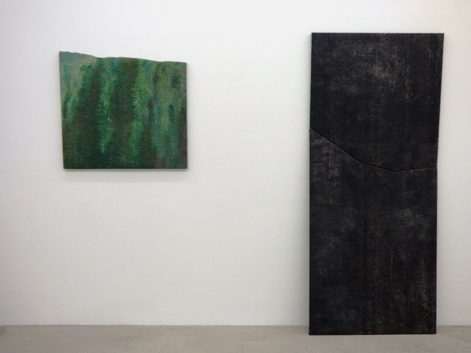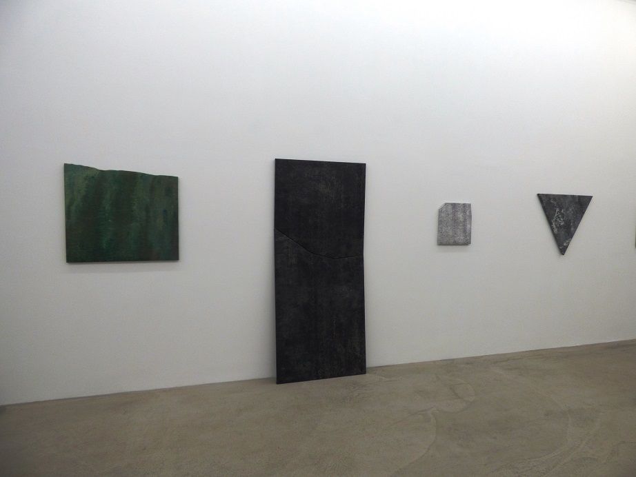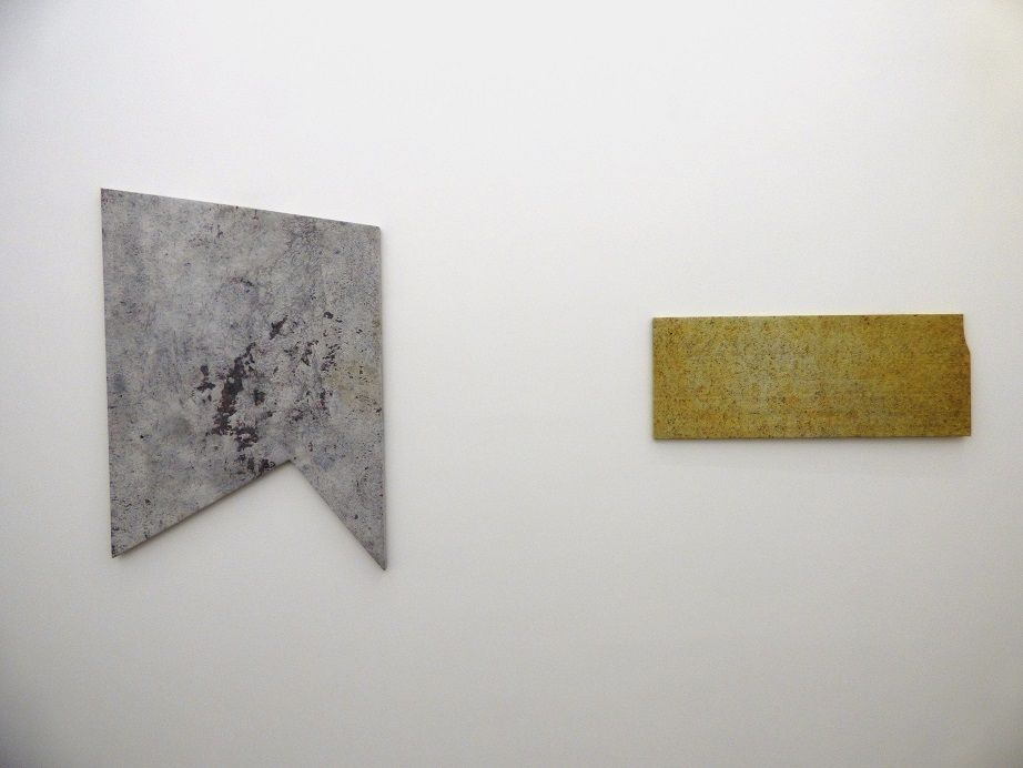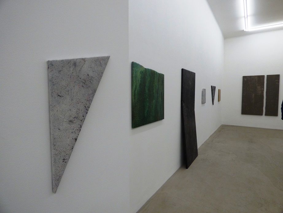 In his new exhibition, Mikkel Carl works with a plastic coated felt that is used for building sites. The fabric is painted from the back, letting paint soak through the felt and leave a pattern on the plastic. With a range of natural colours, the paintings remind of different types of stones – marble, granite and iron. Carl is not only experimenting with our perception of material, he is also playing with the traditional shapes of art. Paintings on a wall tend to be square or rectangular, but in this exhibition the shapes are as different as the colours of the works. Carl explains that when he works, he makes big sheets of felt and the patterns that appear determine the shape of the painting. It is therefore a surprise also to him how the shape will turn out.
