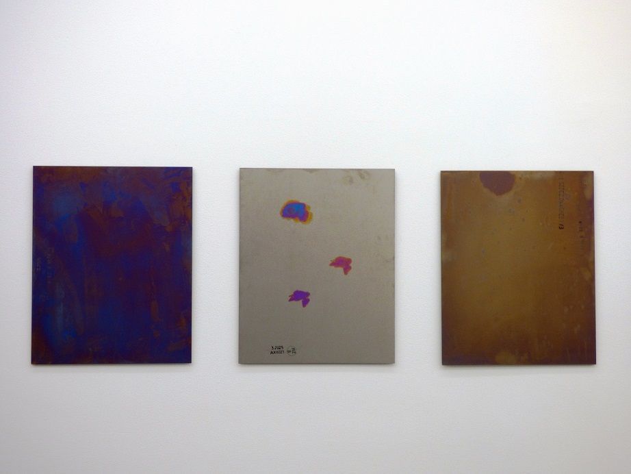 Mikkel Carl lives and works in Sorø, Denmark. He has a long line of exhibitions behind him, both solo and group shows. His works have been displayed in different places such as Copenhagen, Stockholm, Turin, New York, Paris and Rome. His previous exhibition at ANNAELLEGALLERY consisted of anodized titanium plates with amazing patterns in oily and strong colours. These were also on display in the back room during “Language dissolves as a product of love begins”.