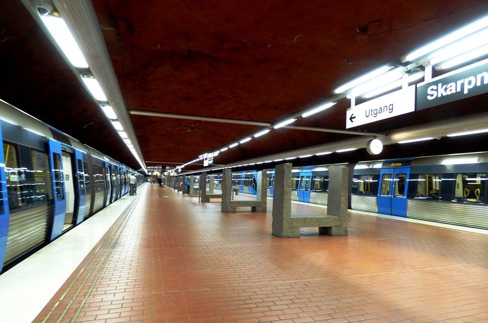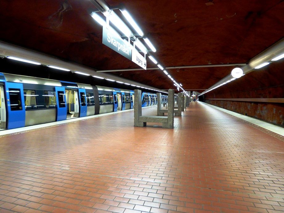 Skarpnäck station was decorated by American sculptor and installation artist Richard Nolan (born 1936), and consists of 17 sculptured benches in dark granite.