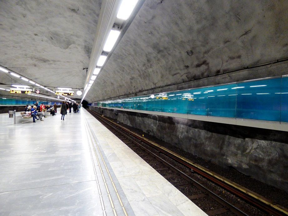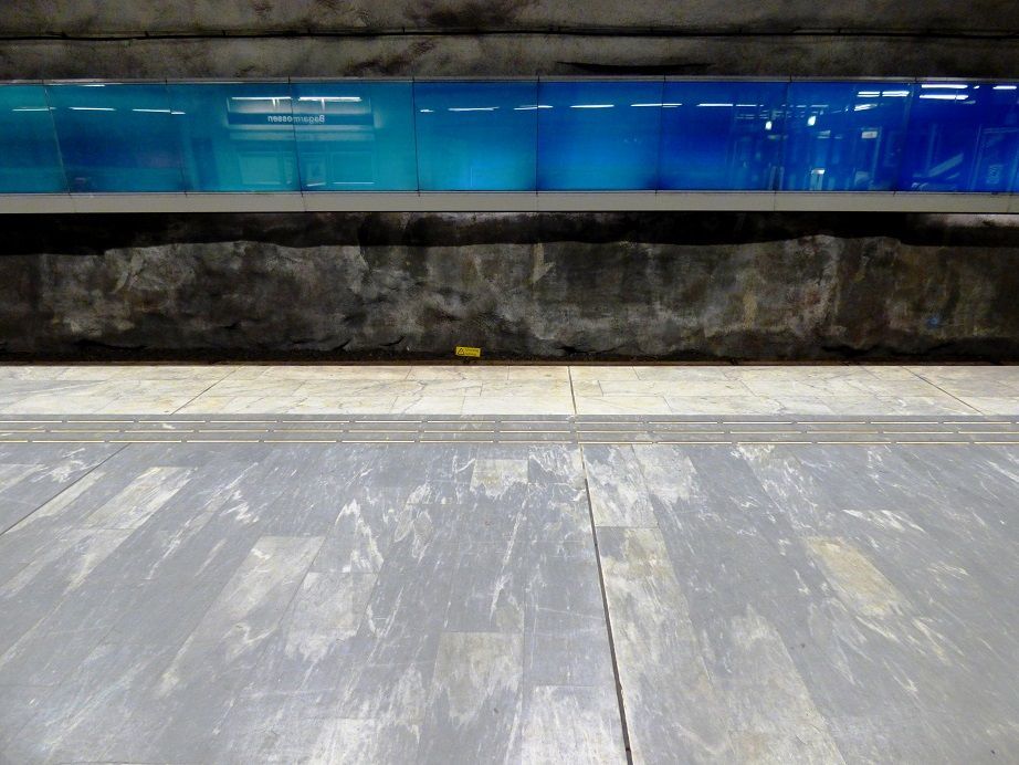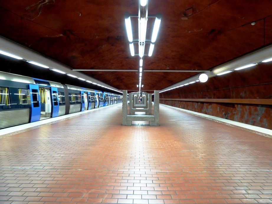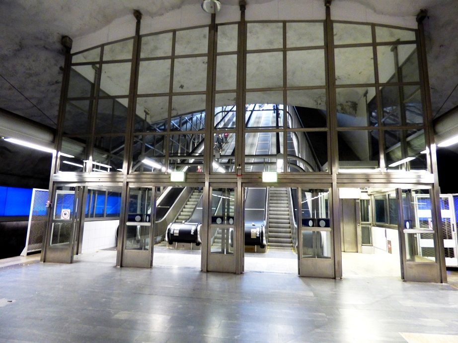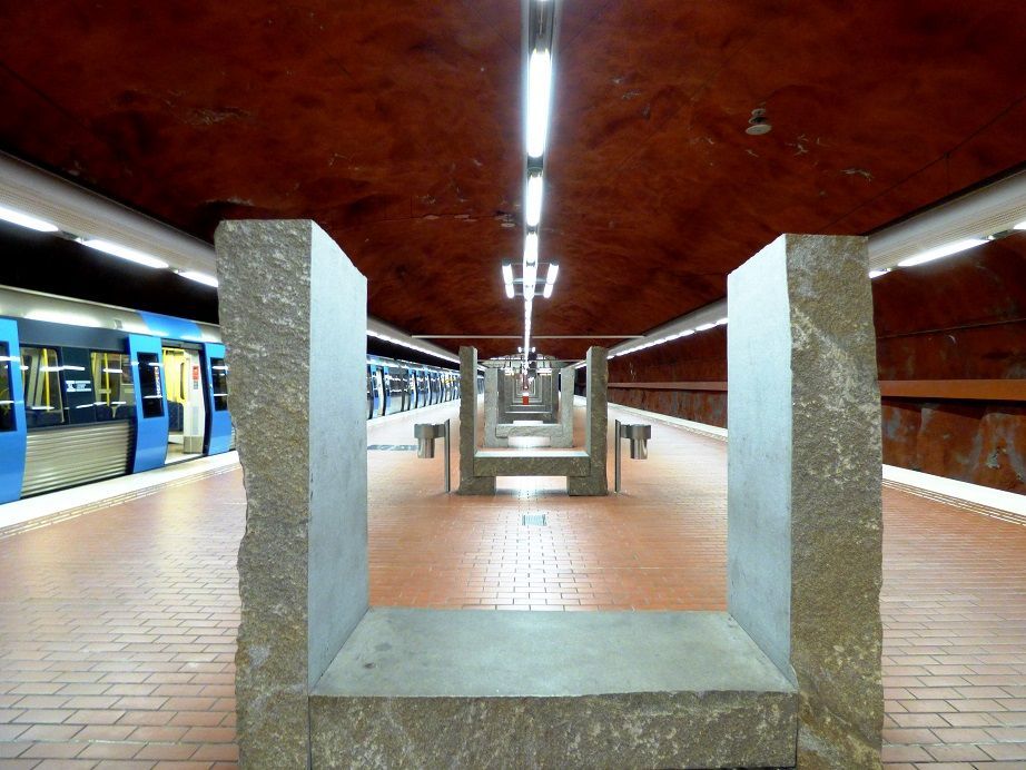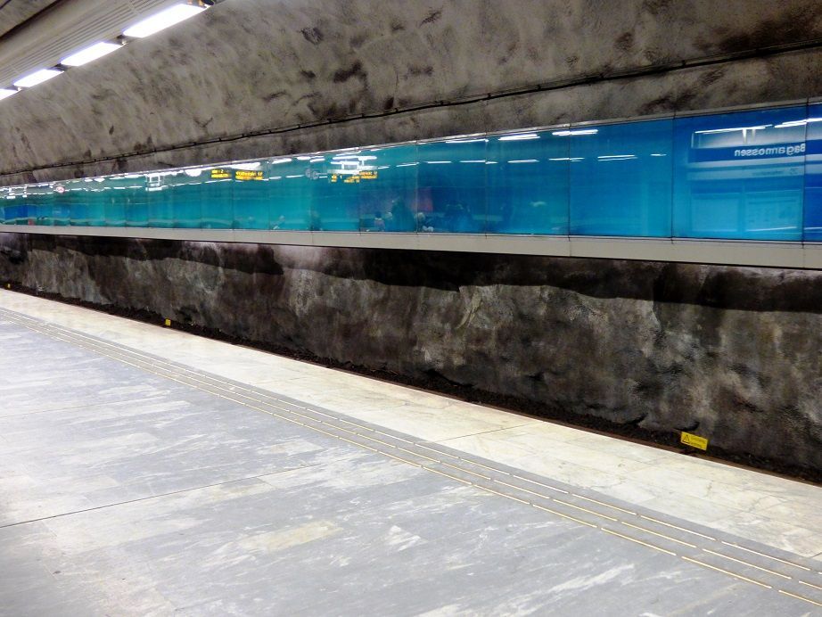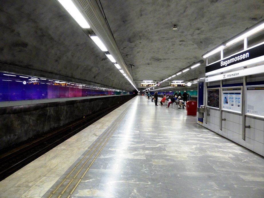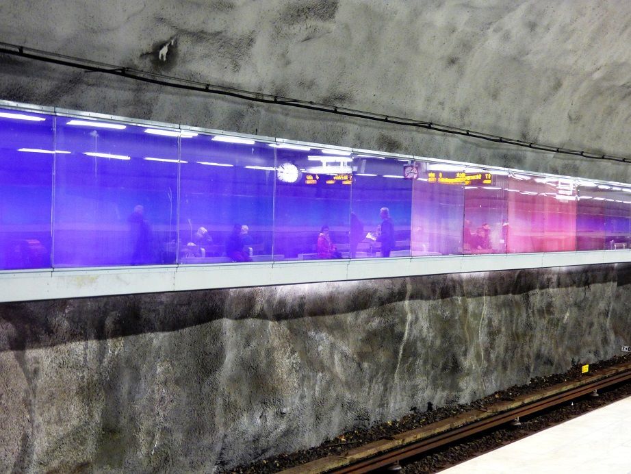 Bagarmossen station is minimalistic with its light grey walls and modern colours. The station has 114 lit glass panels. The artist behind it is German born painter and sculptor Gert Marcus (1914-2008).