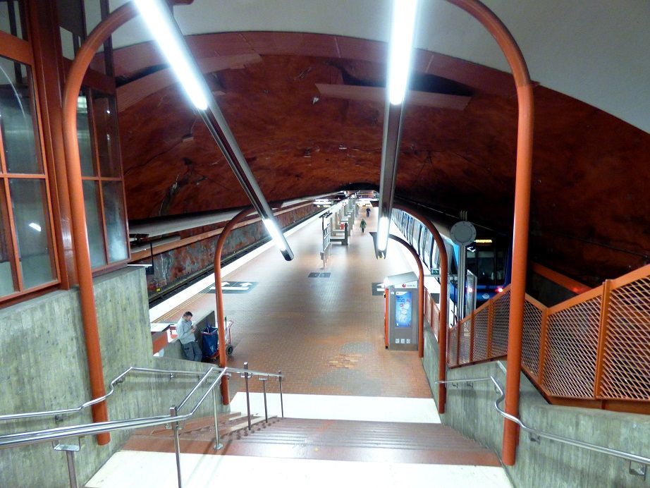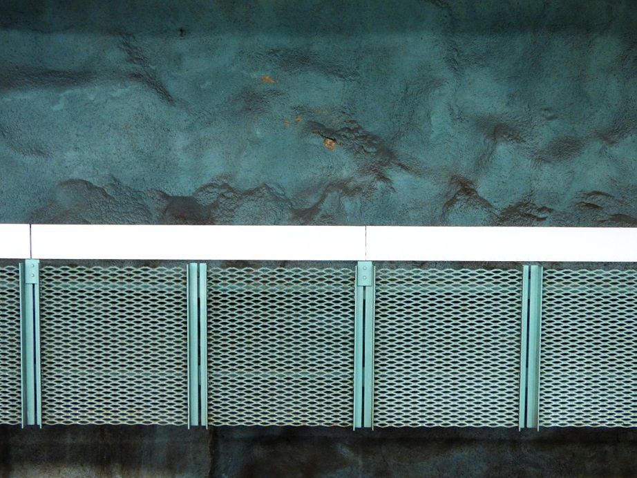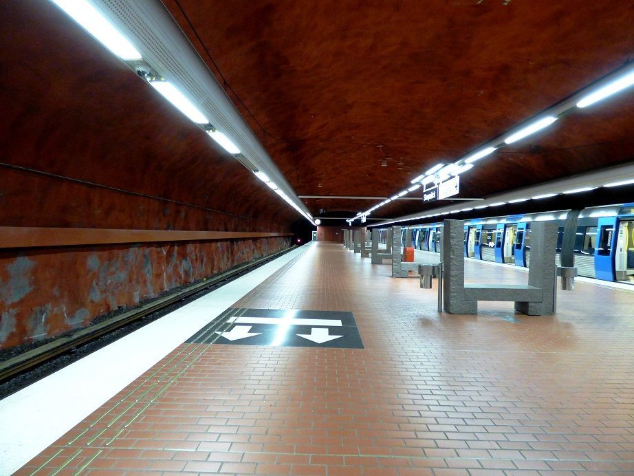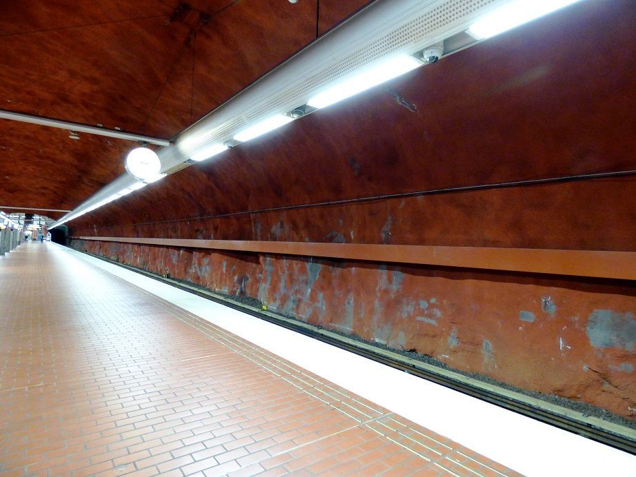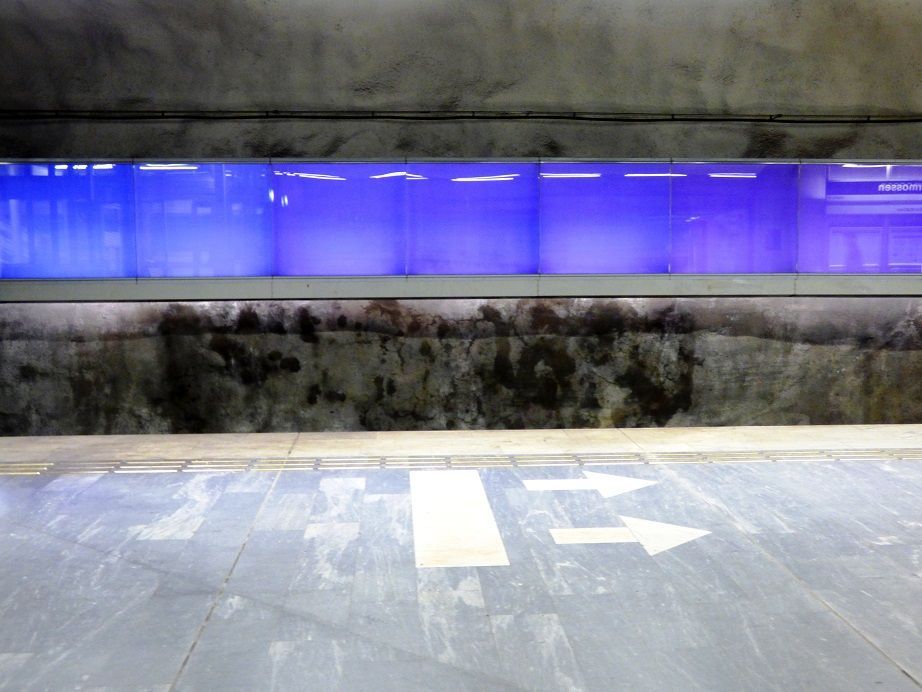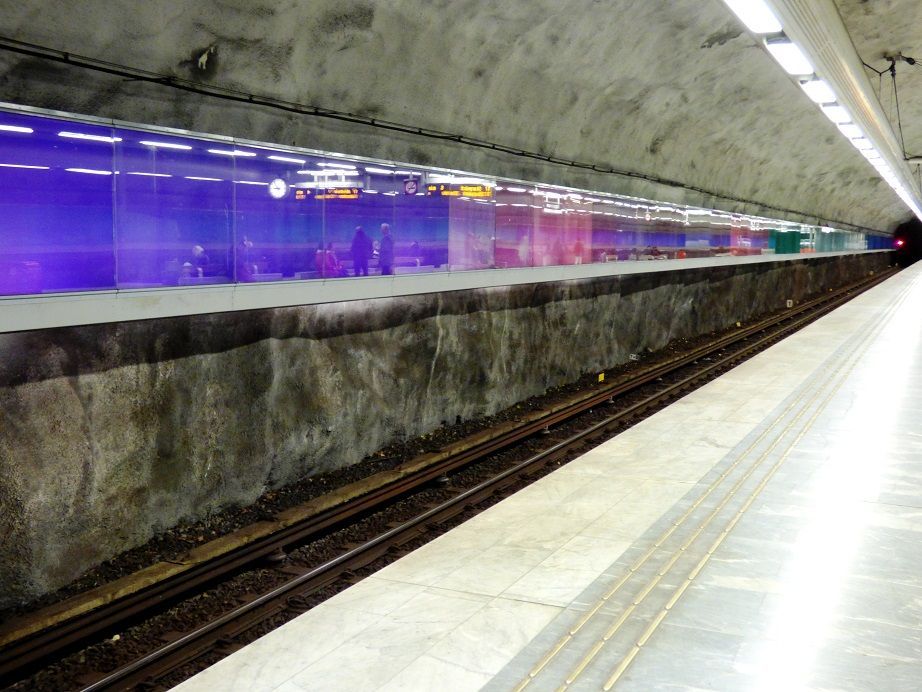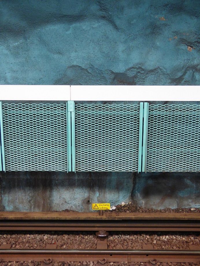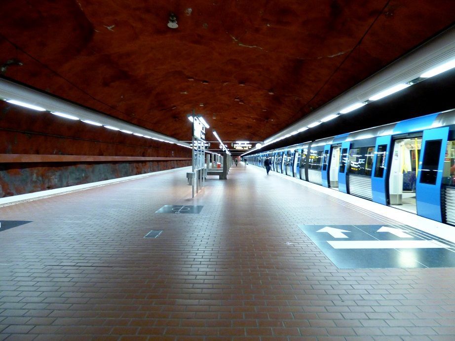 Bagarmossen station is minimalistic with its light grey walls and modern colours. The station has 114 lit glass panels. The artist behind it is German born painter and sculptor Gert Marcus (1914-2008).
